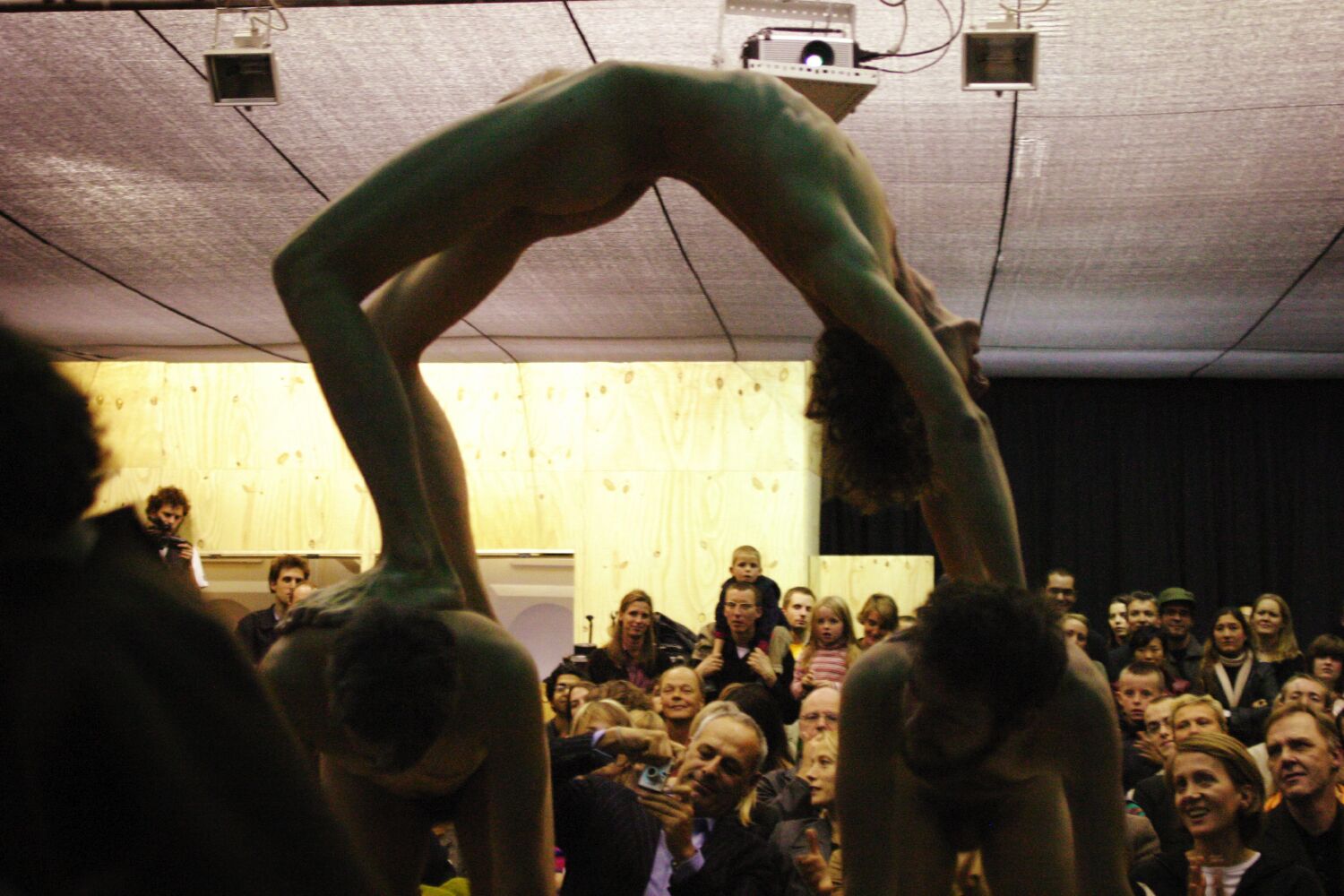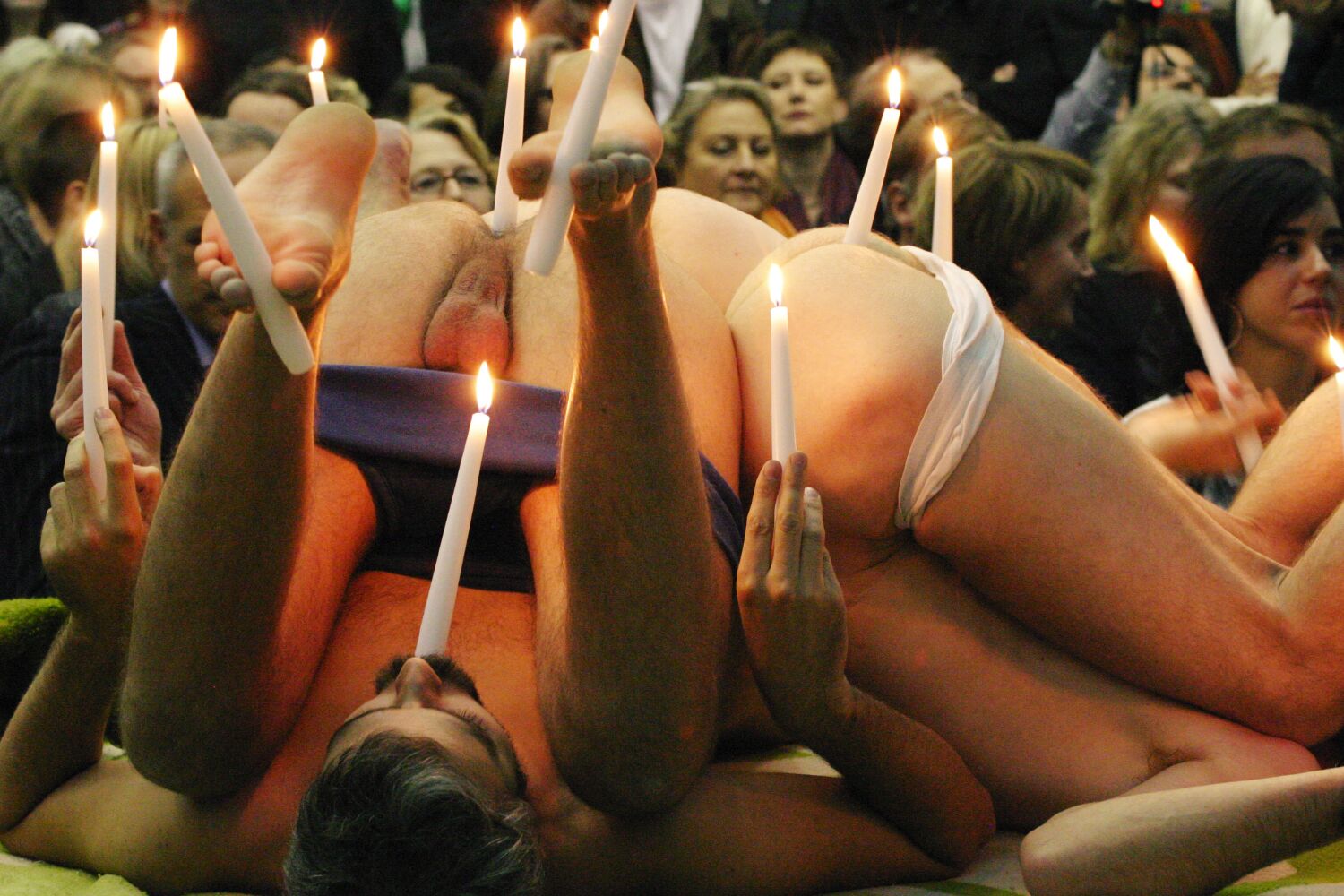 "Gelatin's sold out presentation at London's first Frieze Art Fair welcomed audience, critics and fans into the darkened lecture hall, candle-lit by a table top human birthday cake. They gave a vivid review of recent site specific works from the Shanghai, Berlin and Salzburg employing the technical aid of slides, blackboard diagrams, scary videos, a Chinese translator and helpful assistants. Displaying balance and flexibility the boys re-interpreted their Arc de triomphe piss-in-mouth sculpture. With exquisite aim and a sing-a-long finale, it is safe to say that the Gelatin offered Art Fair goers something slightly different than the regular art fare." (Vargas Organisation)