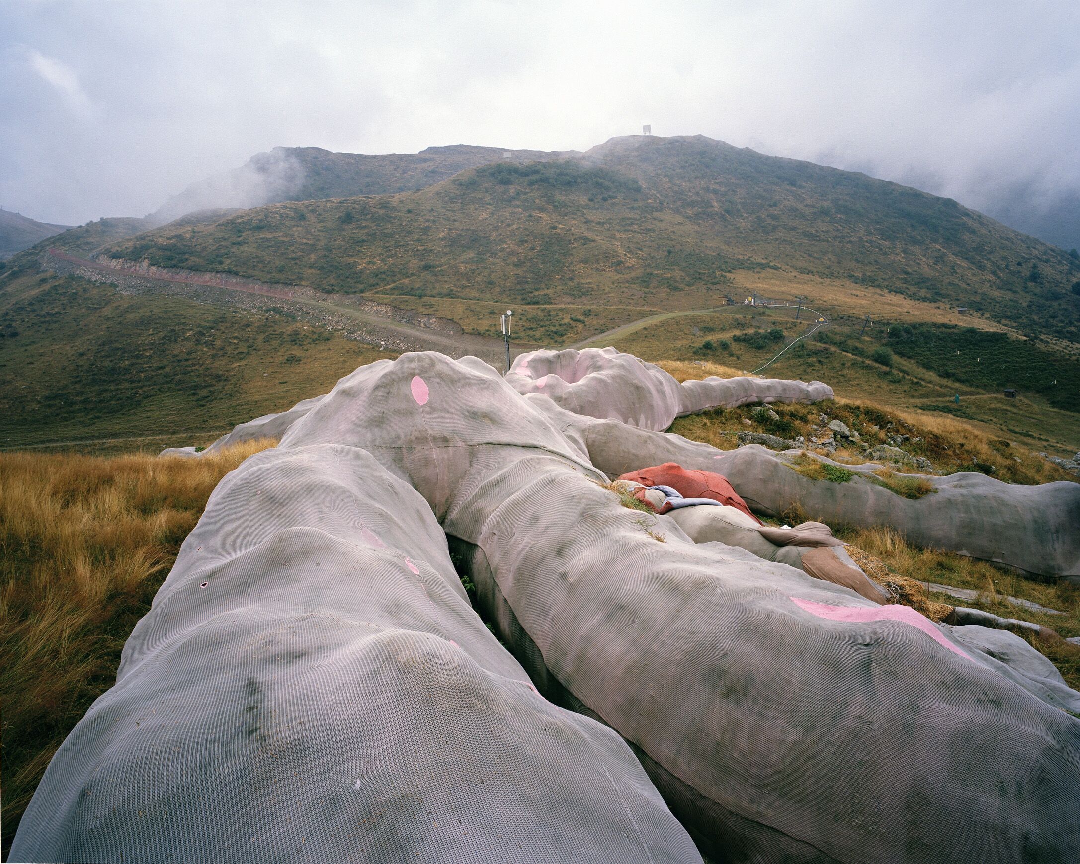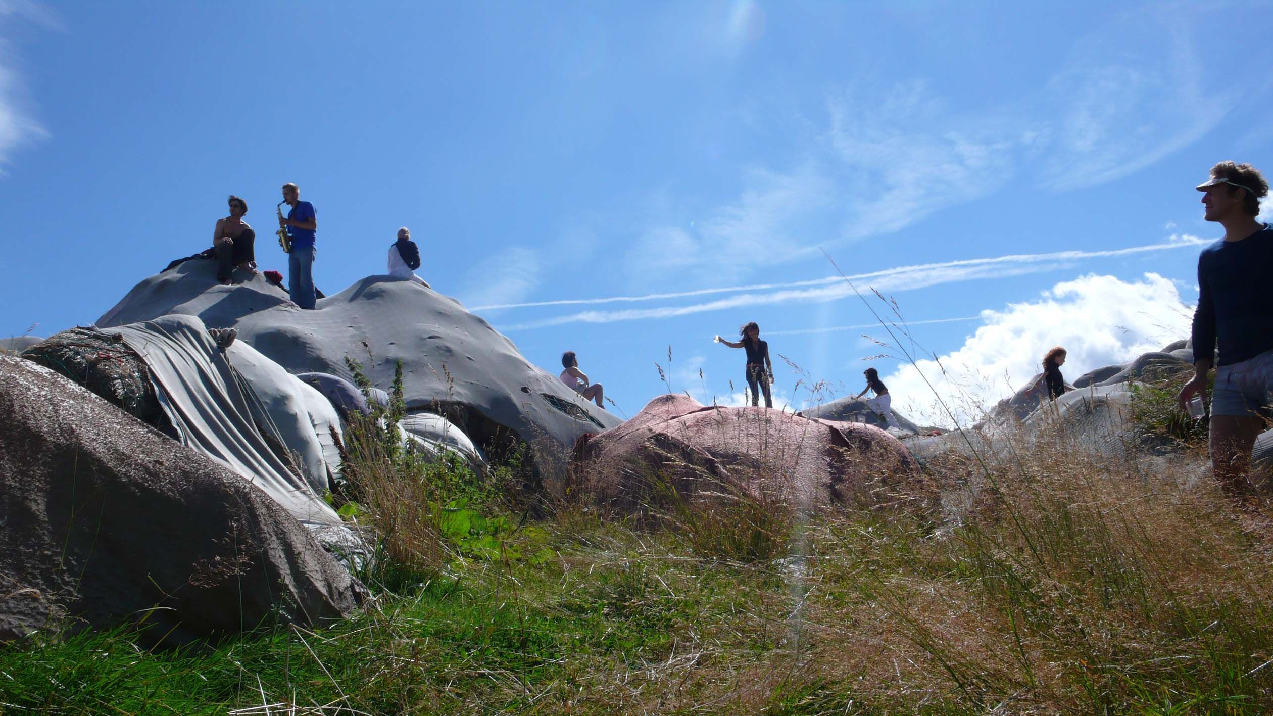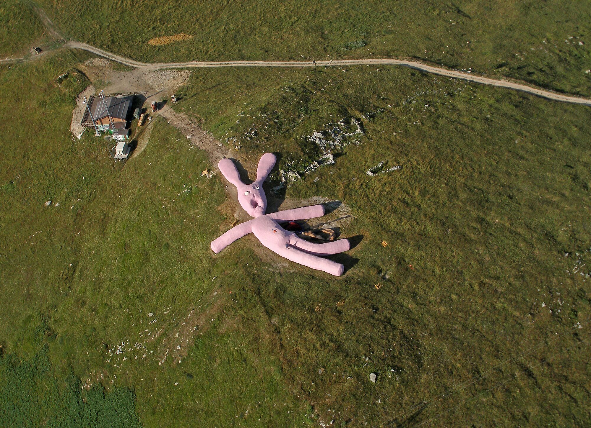 The toilet-paper-pink creature lies on its back: a rabbit-mountain like Gulliver in Lilliput. Happy you feel as you climb up along its ears, almost falling into its cavernous mouth, to the belly-summit and look out over the pink woolen landscape of the rabbitÌs body, a country dropped from the sky; ears and limbs sneaking into the distance; from its side flowing heart, liver and intestines.